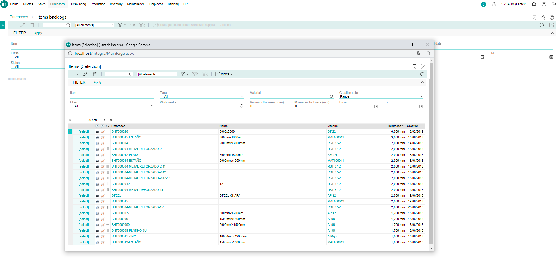 입력 재료 및 트래킹 번호는 시스템에 의해 자동으로 관리된다. 트래킹 번호는 연결된 요소의 라이프 사이클을 따른다. 또한 Lantek integra Purchases는 품질인증서, 공급조건, 규칙 등과 같은 모든 관련 문서들을 관리한다.