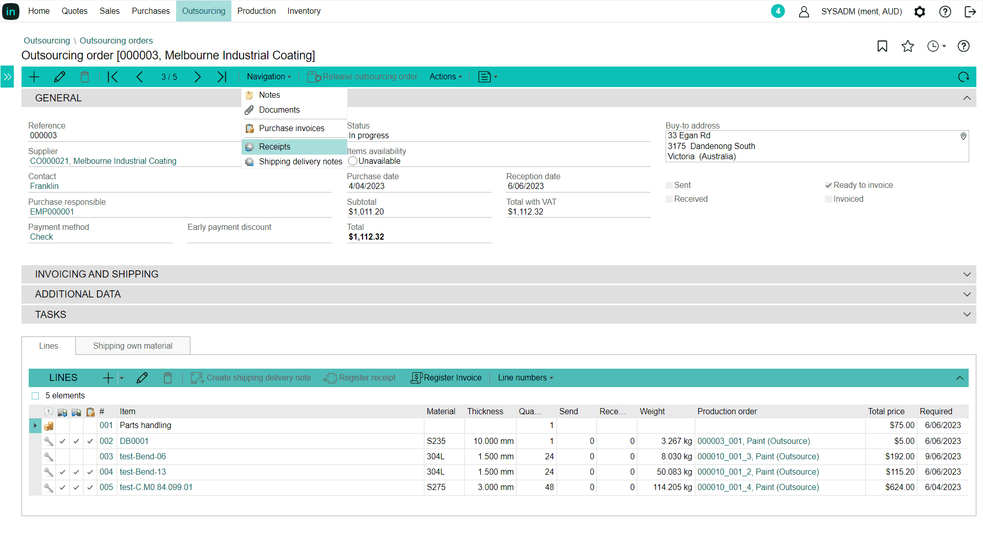 Lantek Integra Purchases는 발행된 모든 구매주문은 물론 그와 관련된 모든 정보와 현재 상태까지 관리한다. 예를 들어 물품을 수령한 후 구매 송장이 생성되고 주문상태가 변경된다. 시스템은 기존에 확인된 재료에 대한 니즈로부터 자동으로 구매 송장을 생성한다.