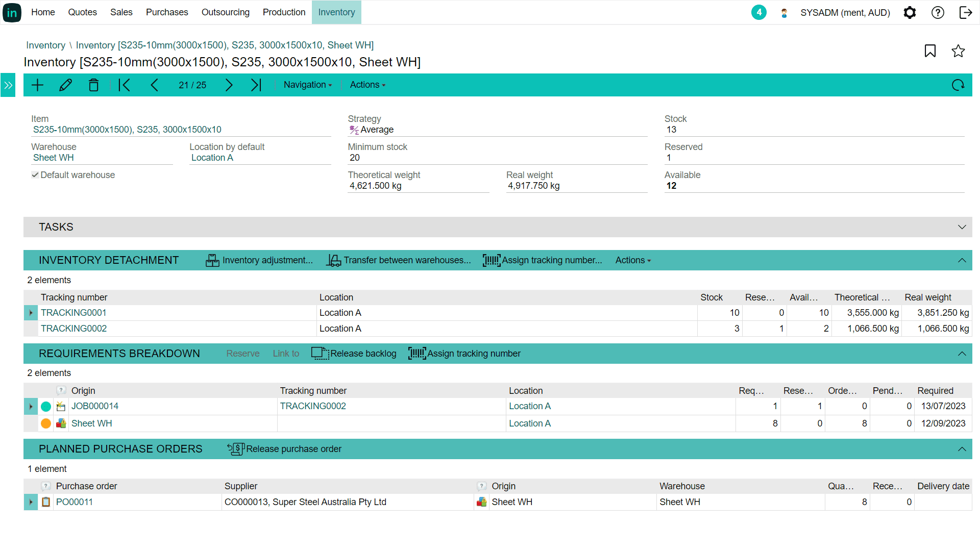 Lantek Integra Purchases를 통하여 각각의 구성된 창고에 대해 제품 유형에 따라서 요약된 혹은 자세한 인벤토리를 볼 수 있다.